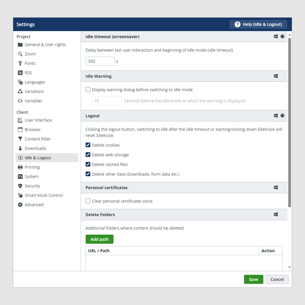 SiteKiosk Online allows administrators to set session timeouts, automatically logging out users after a defined period of inactivity. This prevents unauthorized access to open sessions and helps protect user privacy.